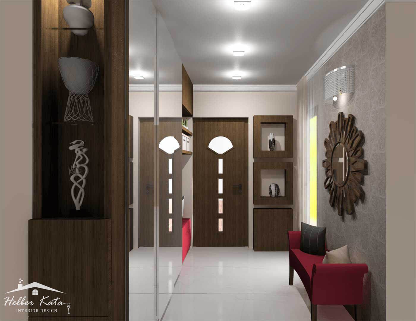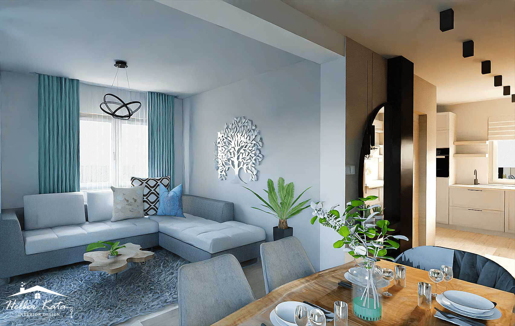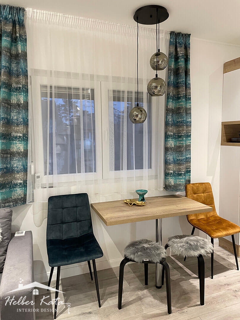 A színvilágot a hideg színek irányába toltam el, kevés meleg színnel harmonizálva azt. A tapétákon található minták vonzzák a szemet, amik az enteriőrfotókon is egyediek és mutatósak. A szobák nagyon kicsi alapterülettel rendelkeztek, ezért fontos volt a megfelelő helykihasználás, ebből kifolyólag olyan egyedi, ágy köré épített szekrényeket terveztem, amik csupán két éjjeli szekrény nagyságú teret vesznek el a szoba alapterületéből. Az érdekes formavilágú lámpák, mind-mind díszei a térnek, valamint a gipszkarton kiemelések, és a különböző LED-világítás megoldások, teszik hangulatossá az enteriőrt.