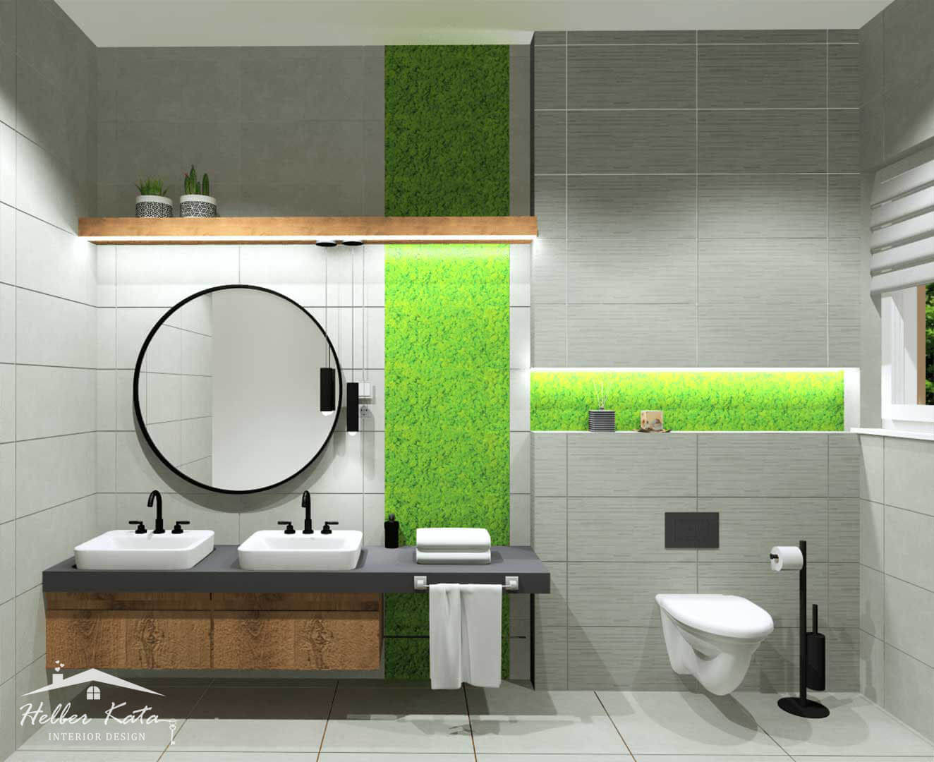 A fürdőszoba modern szürkeségét az izlandi zuzmó mintás, edzett üvegcsempe töri meg, ami kis természet adta melegséget varázsol a térbe. Ezt a hangulatot emeli az üveg zuhanykabin, és üveg mosdó, króm csillogású kiegészítőkkel.