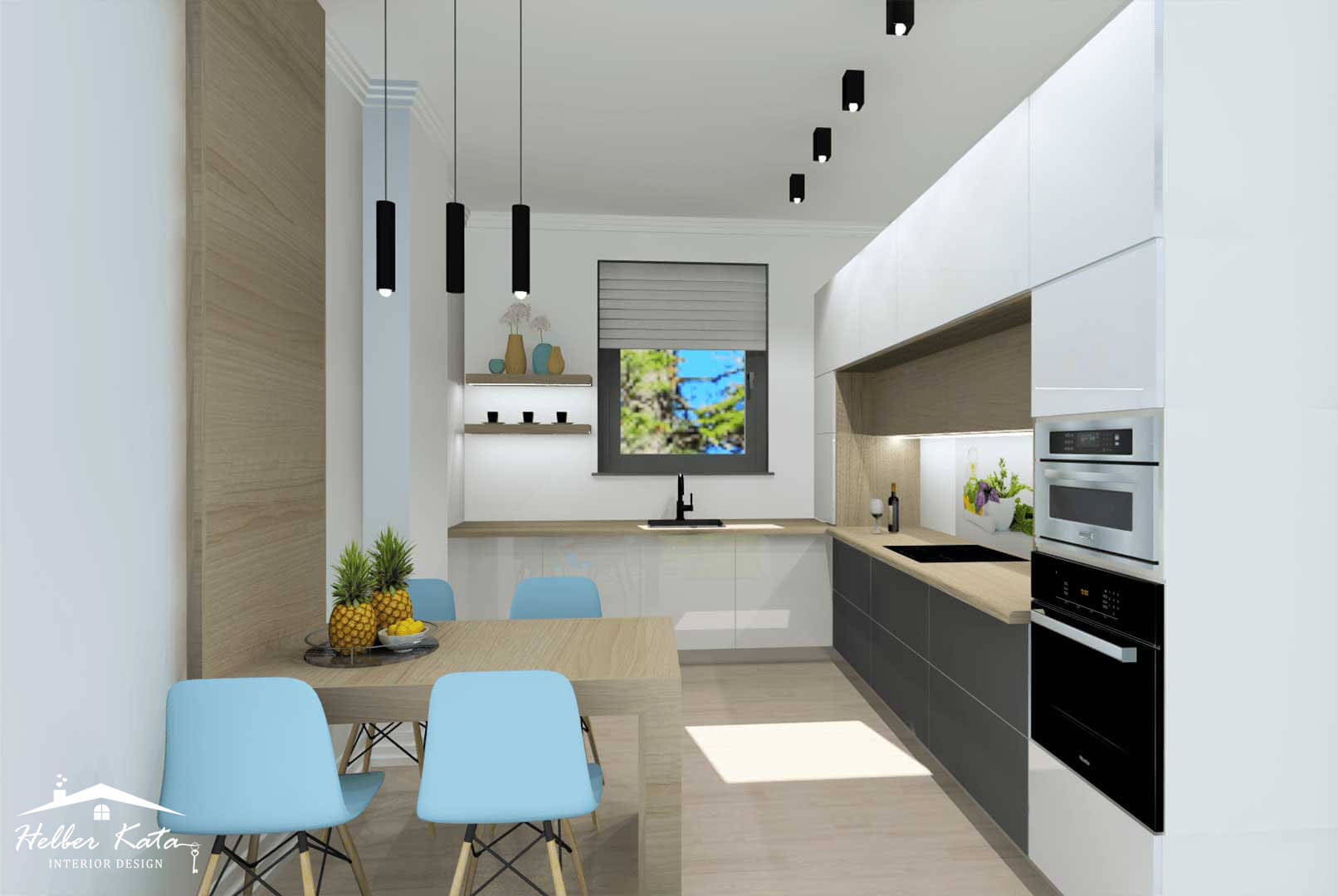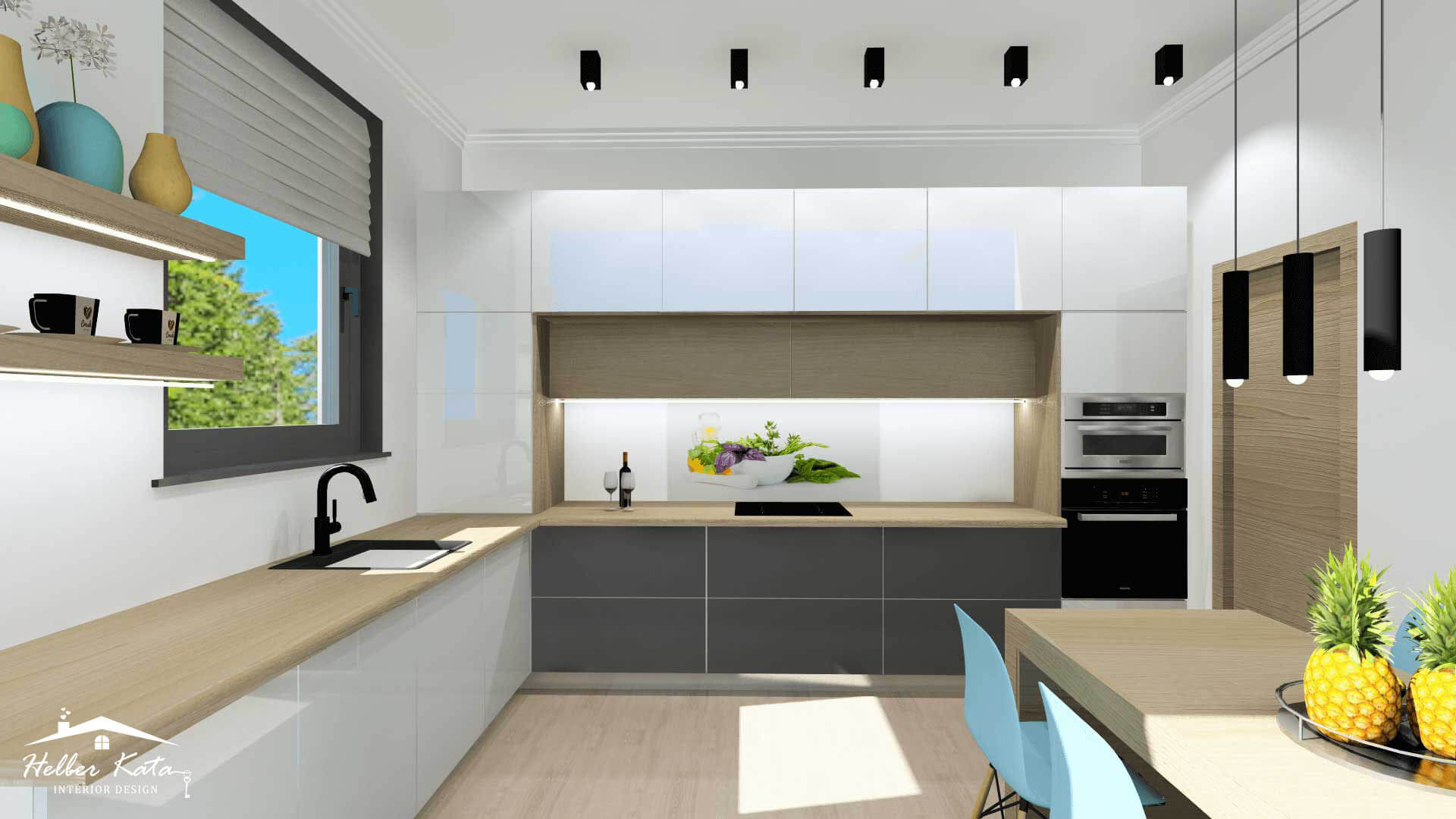 A konyha kialakításánál modern vonalú, magas fényű fehér és halifax tölgy bútorlap kombinációt terveztem, modern fehér konyhai gépekkel, síkba épített mikrohullámú sütővel, és oldalt kihúzható kamra résszel. A hátlap osztott, részben edzett üveg, aminek a hátoldalára egyedileg készített fotóból, egy dekoratőr segítségével, fólia került. A képen található csendélet visszaköszön a fölötte elhelyezett lebegő polcon, dekorként is. A mellette lévő erkélyajtóból gyönyörű kilátás nyílik a türkizkék színű tengerre. A méretre készült, helytakarékos étkezőasztal, és a tároló funkcióval rendelkező sarokpad, ugyancsak halifax tölgy bútorlapból készült, tökéletesen harmonizál a konyhabútorral.